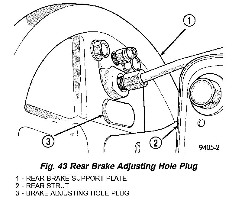 3. Remove the rear brake adjusting hole rubber plug from the rear brake shoe support plate (Fig. 43).
