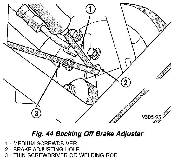 5. If the shoes are in the over-adjusted position, insert a thin screwdriver into brake adjusting hole and push back the adjusting lever out of engagement with star wheel (Fig. 44). Take care not to bend the adjusting lever. While holding the adjusting lever out of engagement with star wheel, back off the star wheel until the tire and wheel assembly is free to turn without dragging. Repeat the adjustment procedure.