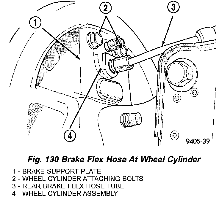 4. Disconnect the rear brake flex hose from the wheel cylinder (Fig. 130).