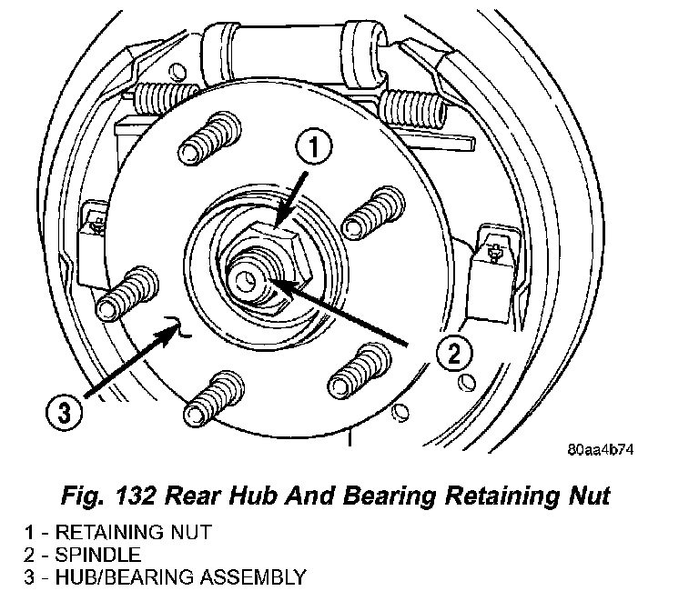 8. Install the rear hub and bearing assembly on the spindle. Install a new hub and bearing retaining nut (Fig. 132). Tighten the retaining nut to a torque of 217 Nm (160 ft. lbs.). Install dust cap.