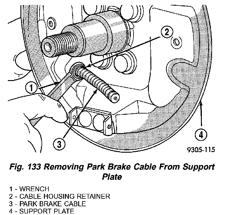 10. Position a 1/2 inch wrench over the retainer fingers on the end of the parking brake cable (Fig. 133). Compress the cable housing retaining fingers with the wrench, then pull the cable housing out of the support plate. Remove the wrench as the parking brake cable retainer is freed from the mounting hole in the brake support plate.