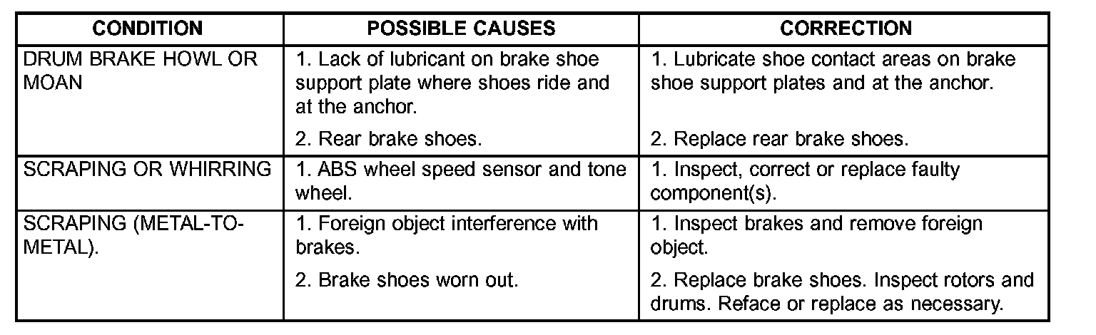 DIAGNOSIS AND TESTING - BASE BRAKE SYSTEM DIAGNOSIS CHARTSNOTE: There are three diagnosis charts shown that cover the RED BRAKE WARNING INDICATOR LAMP, BRAKE NOISE and OTHER BRAKE CONDITIONS.