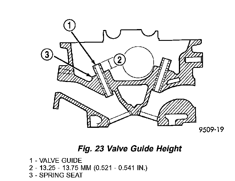 4. Using a small hole gauge and a micrometer, measure valve guides in 3 places top, middle and bottom (Fig. 22). Replace guides if they are not within specification.