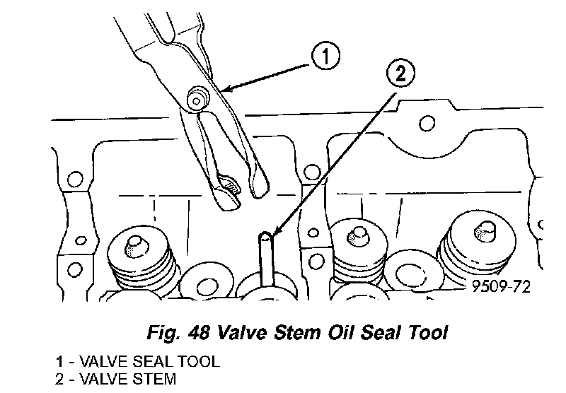 2. Install new valve stem seals on all valves using a valve stem seal tool (Fig. 48). The valve stem seals should be pushed firmly and squarely over valve guide.