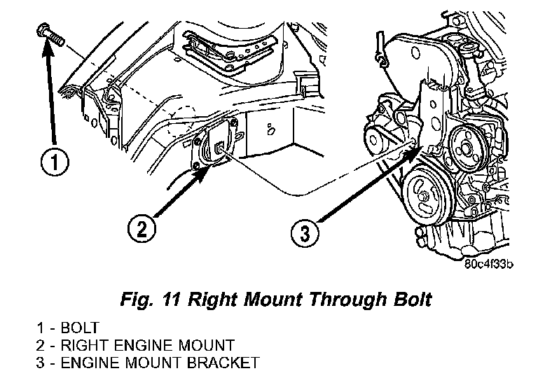 46. Remove right mount through bolt (Fig. 11) and left mount attaching bolts (Fig. 12).