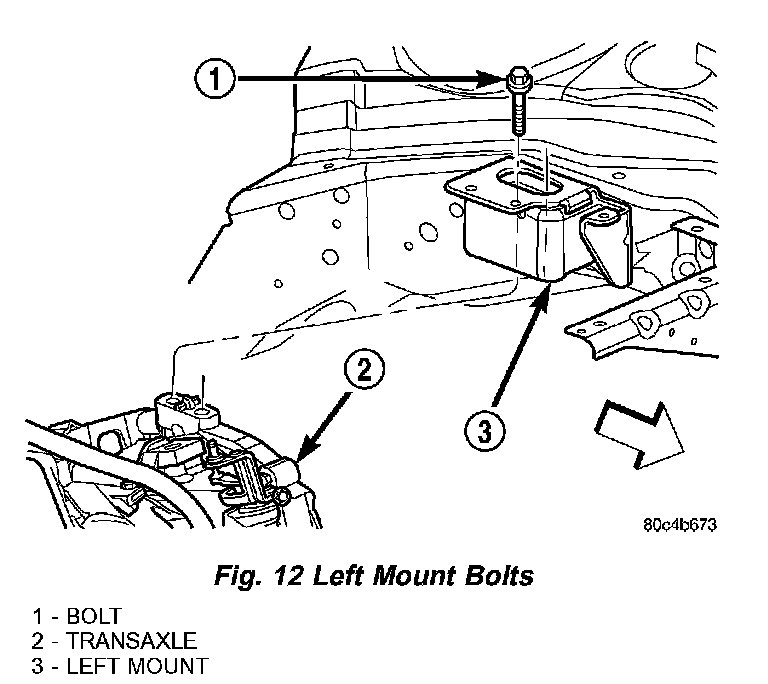 2. Continue lowering vehicle until engine/transaxle aligns to mounting locations. Install mounting bolts at the right and left engine/transaxle mounts (Fig. 11) and (Fig. 12). Tighten bolts to 118 Nm (87 ft. lbs.).