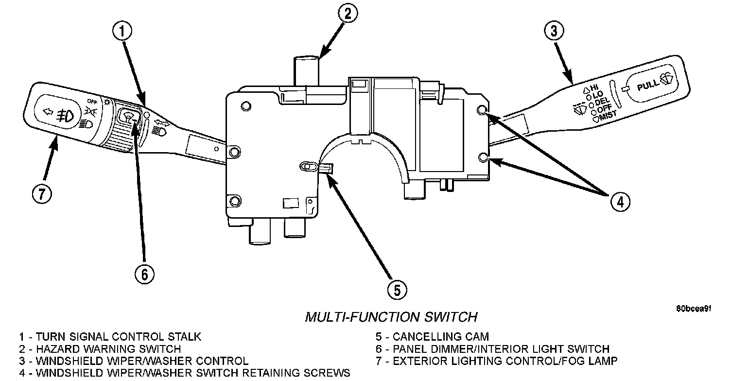 - Turn Signal Control - The turn signal control stalk actuates the turn signal switch. When the control stalk is moved in the upward direction, the right turn signal circuitry is activated; and, when the control stalk is moved in the downward direction, the left turn signal circuitry is activated. The multi-function switch turn signal circuitry simultaneously provides a signal to the turn signal sense of the combination flasher to activate or deactivate the flasher output, and directs the output of the flasher to the proper turn signal lamps. The turn signal switch has a detent position in each direction that provides turn signals with automatic cancellation, and an intermediate, momentary position in each direction that provides turn signals only until the left multi-function switch control stalk is released. When the control stalk is moved to a turn signal switch detent position, the cancel actuator extends toward the center of the steering column. A turn signal cancel cam that is integral to the clock spring mechanism rotates with the steering wheel and the cam lobes contact the cancel actuator when it is extended from the multi-function switch. When the steering wheel is rotated during a turning maneuver, one of the two turn signal cancel cam lobes will contact the turn signal cancel actuator. The cancel actuator latches against the cancel cam rotation in the direction opposite that which is signaled. In other words, if the left turn signal detent is selected, the lobes of the cancel cam will ratchet past the cancel actuator when the steering wheel is rotated to the left, but will unlatch the cancel actuator as the steering wheel rotates to the right and returns to center, which will cancel the turn signal event and release the control stalk from the detent so it returns to the neutral OFF position.