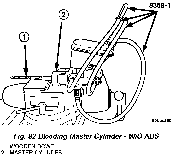 b. Attach Master Cylinder Bleed Tube, Special Tool 8358-1, to the primary port of the master cylinder and tighten in place (Fig. 93). Attach Master Cylinder Bleed Tube, Special Tool 8358-2, to the secondary port of the master cylinder and tighten in place. Position the other end of the tubes into the master cylinder reservoir so their outlets are below the surface of the brake fluid in the reservoir when filled.