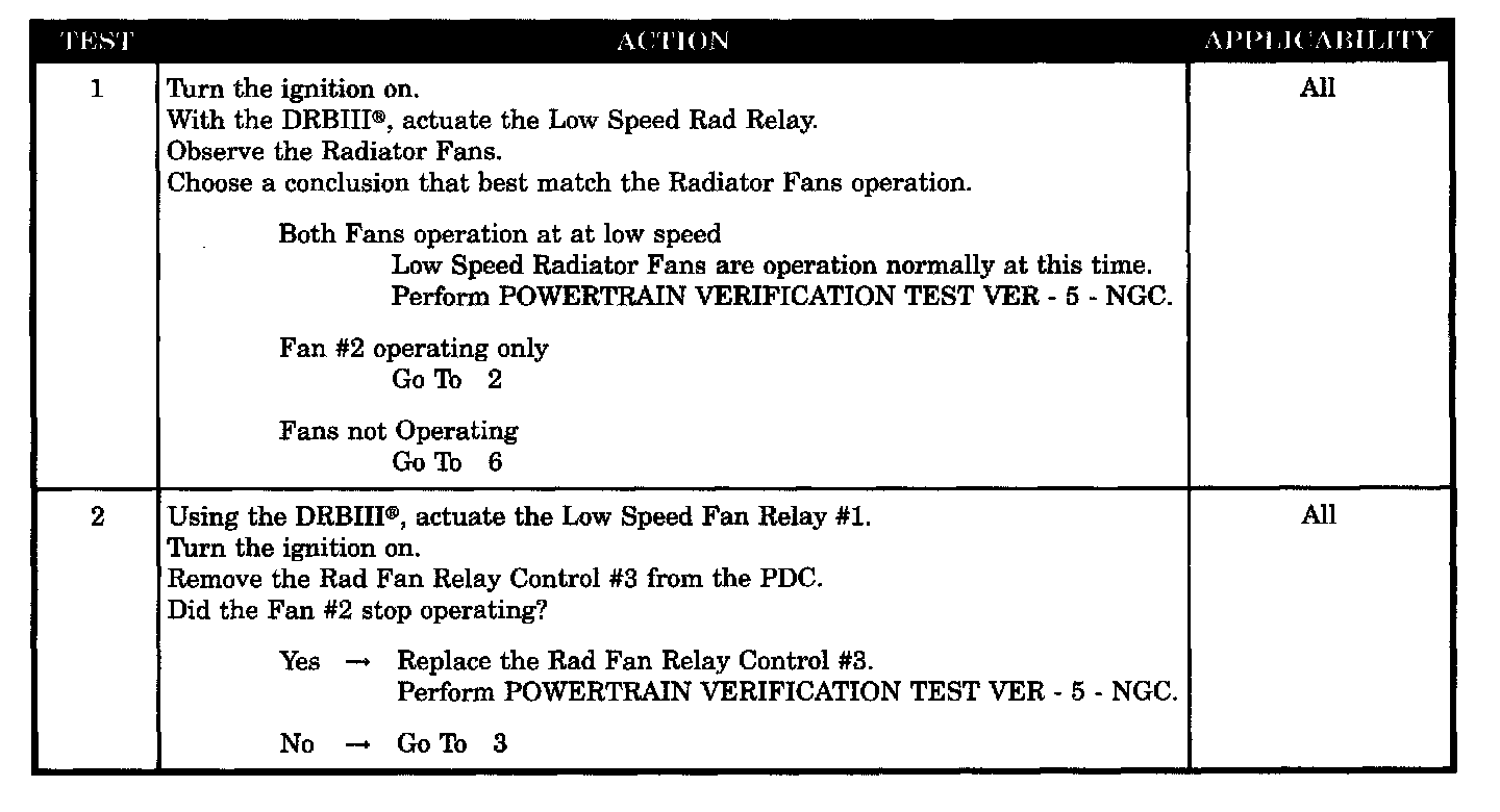 - Low speed rad fan output shorted to ground between relay #2 and fan #2
