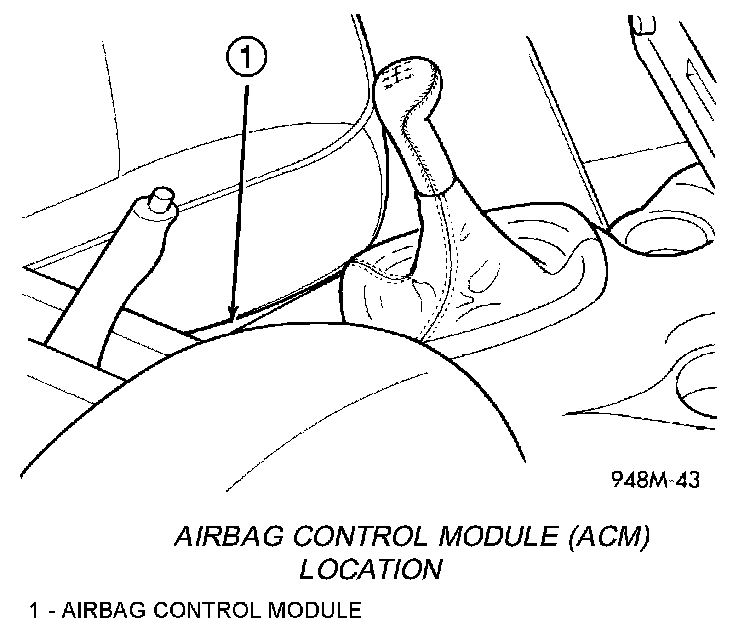The Airbag Control Module (ACM) is also sometimes referred to as the Occupant Restraint Controller (ORC). The ACM contains the sensing element, safing sensor, and energy reserve capacitor. The module is mounted on the tunnel/floor pan between the gear shift lever and the park brake lever.