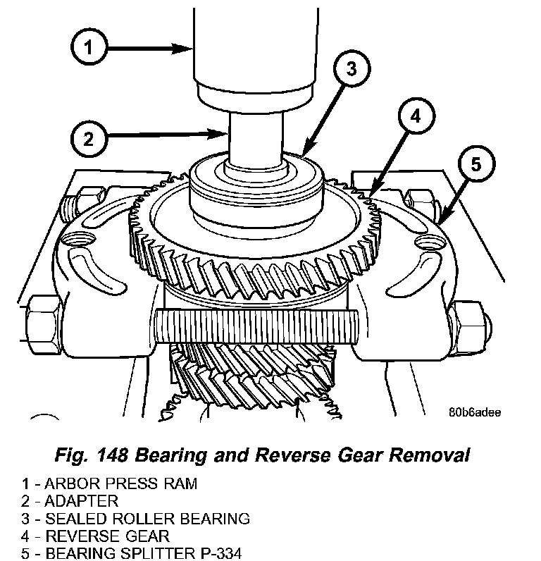 1. Install intermediate shaft assembly to arbor press table with bearing splitter P-334 under the reverse gear.