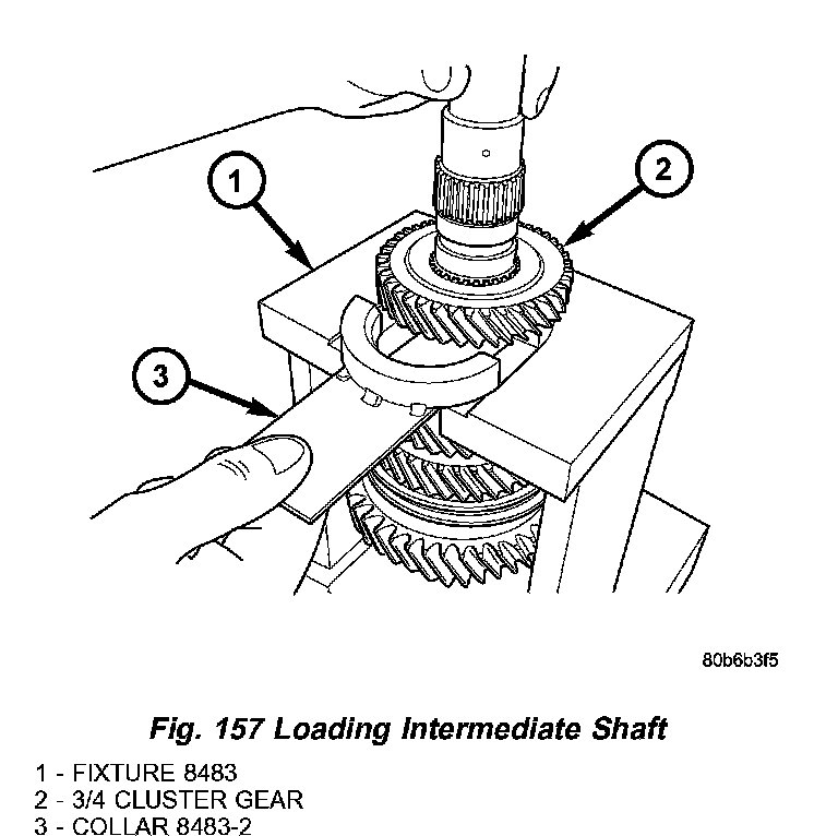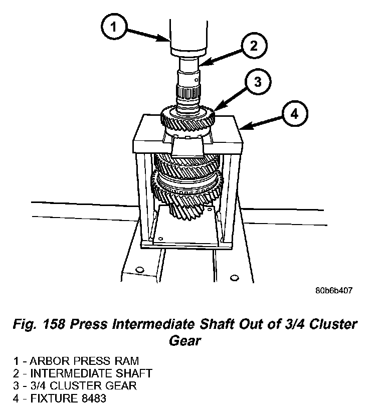 11. Using an arbor press, press intermediate shaft out of 3/4 cluster gear (Fig. 158).