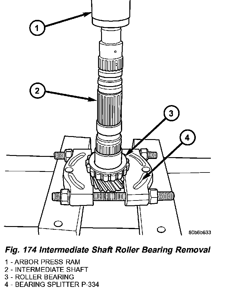 26. Press intermediate shaft out of roller bearing supported by bearing splitter P-334 (Fig. 174). Roller bearing is not re-usable once removed. It is necessary to install a new roller bearing upon re-assembly.