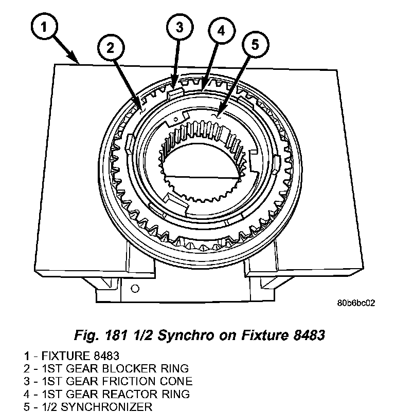 6. Install 1/2 synchro to fixture 8483. Insert 1st gear blocker ring, friction cone, and reactor ring as shown in (Fig. 181).