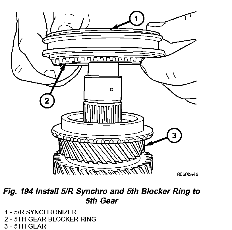 17. Install 5th gear synchronizer assembly to intermediate shaft (Fig. 194). When installing 5/R synchronizer, make sure to align oil slots on synchronizer hub face with oil hole in the shaft splined hub journal.