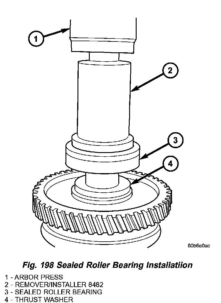22. Install intermediate shaft sealed roller bearing and thrust washer using installer 8482 (Fig. 198).