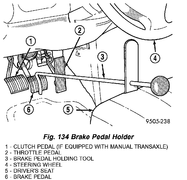 1. Using a brake pedal holder, depress the brake pedal past its first one inch of travel and hold it in this position (Fig. 134). This will isolate the master cylinder from the brake hydraulic system and will not allow the brake fluid to drain out of the master cylinder reservoir.
