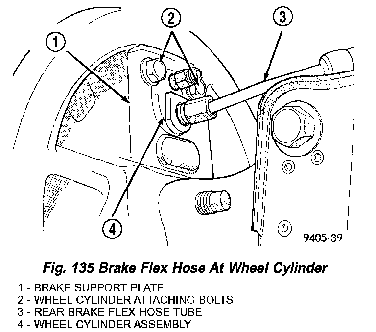 4. Disconnect the rear brake flex hose from the wheel cylinder (Fig. 135).