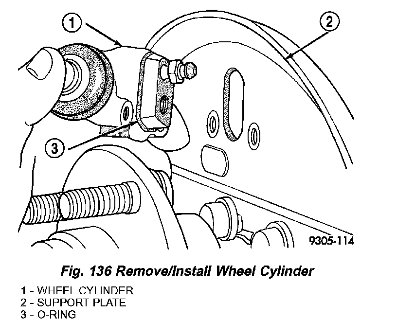 1. Install a new O-ring at the mating surface of the wheel cylinder-to-brake support plate (Fig. 136).