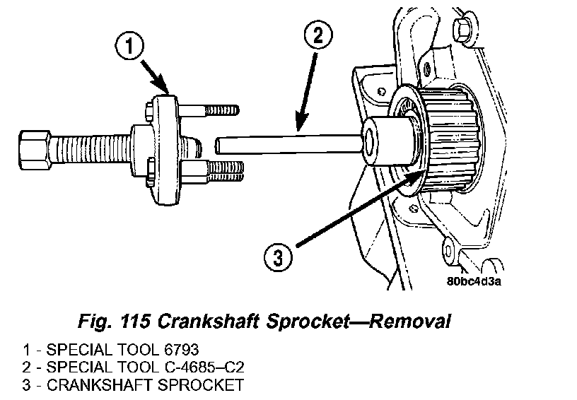 7. Remove crankshaft sprocket using Special Tool 6793 and insert C-4685-C2 (Fig. 115).