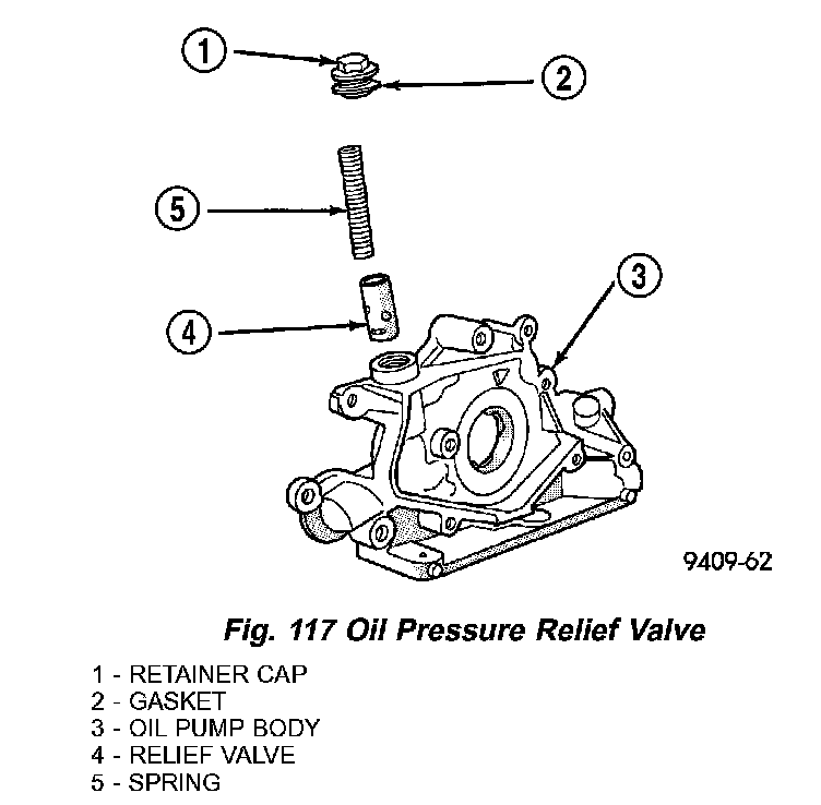 CAUTION: Oil pump pressure relief valve must be installed as shown in (Fig. 117) or serious damage may occur.