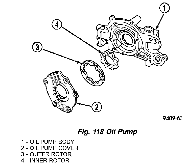 4. Install threaded plug and gasket to the oil pump (Fig. 117). Tighten plug to 41 Nm (30 ft. lbs.).