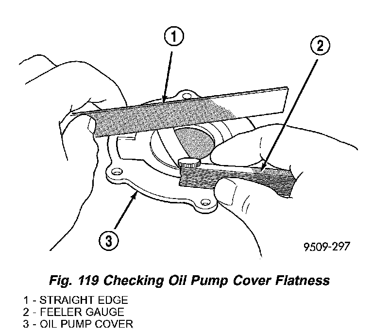 2. Lay a straightedge across the pump cover surface (Fig. 119). If a 0.076 mm (0.003 inch) feeler gauge can be inserted between cover and straight edge, cover should be replaced.