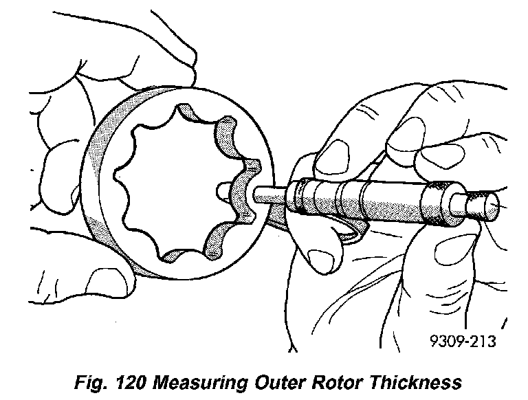 3. Measure thickness and diameter of outer rotor. If outer rotor thickness measures 7.64 mm (0.301 inch) or less (Fig. 120), or if the diameter is 79.95 mm (3.148 inch) or less, replace outer rotor.