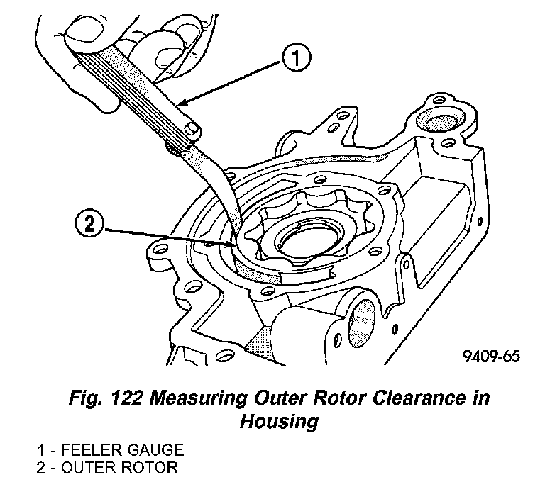 5. Slide outer rotor into pump housing, press to one side with fingers and measure clearance between rotor and housing (Fig. 122). If measurement is 0.39 mm (0.015 inch) or more, replace housing only if outer rotor is in specification.