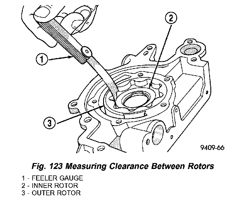 6. Install inner rotor into pump housing. If clearance between inner and outer rotors (Fig. 123) is 0.203 mm (0.008 inch) or more, replace both rotors.