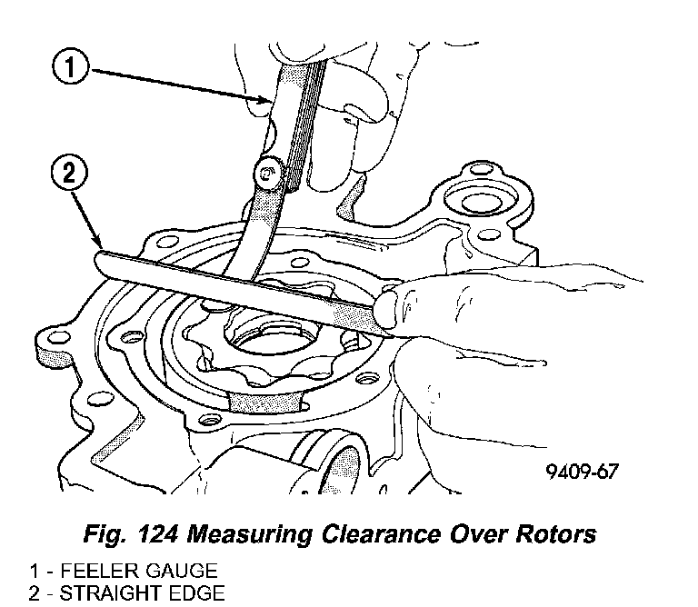 7. Place a straightedge across the face of the pump housing, between bolt holes. If a feeler gauge of 0.102 mm (0.004 inch) or more can be inserted between rotors and the straightedge, replace pump assembly (Fig. 124). ONLY if rotors are in specs.
