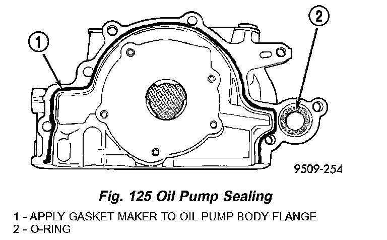 2. Apply Mopar Gasket Maker to oil pump as shown in (Fig. 125). Install o-ring into oil pump body discharge passage.