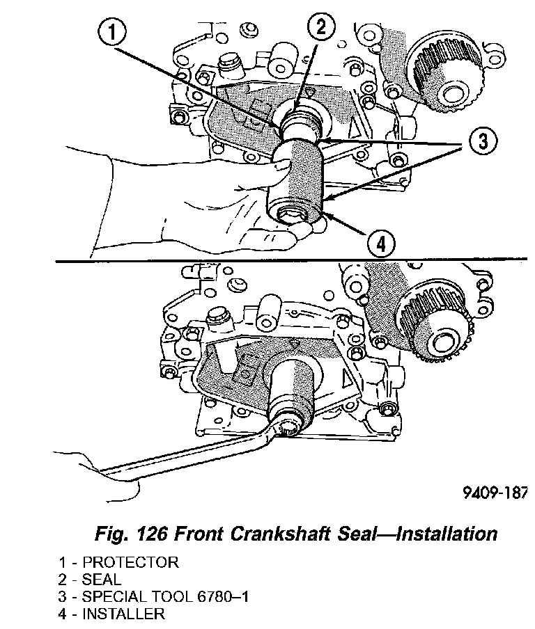 6. Install new front crankshaft seal using Special Tool 6780 (Fig. 126).