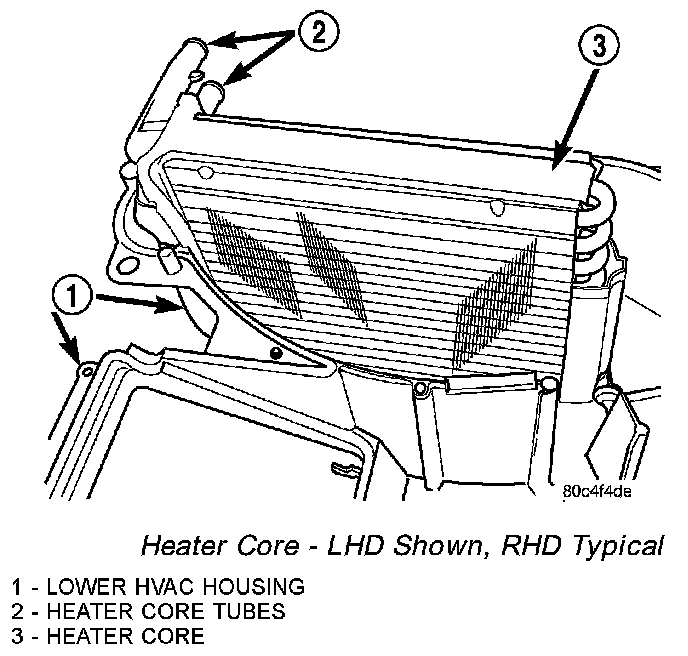 The heater core is located in the HVAC housing, behind the instrument panel. It is a heat exchanger made of rows of tubes and fins. One end of the core is fitted with a molded plastic tank that includes the integral heater core tubes.