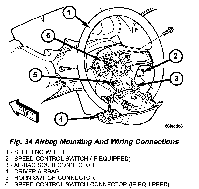 6. Position the driver airbag near the steering wheel (Fig. 34). Connect the horn switch wiring lead to the connector on the back of the airbag.