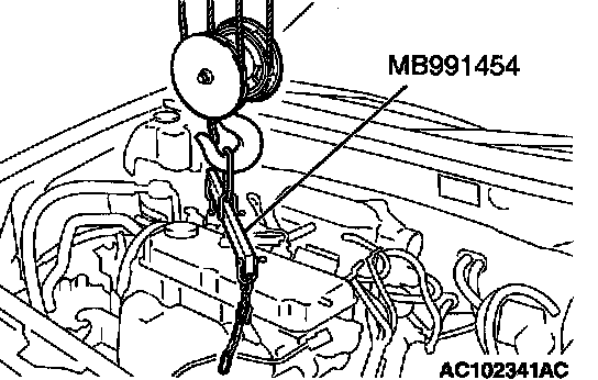 Remove the chain block and support the engine assembly with special tools MB991895.
