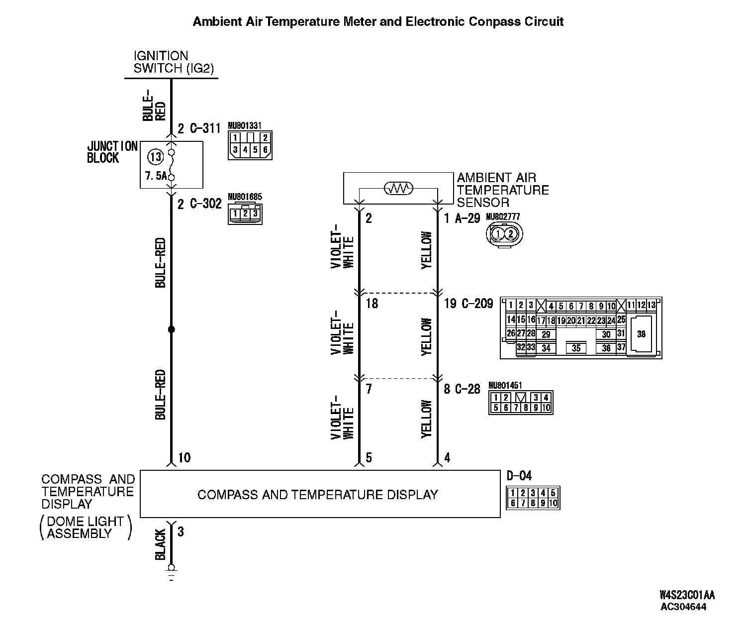 The inside rear view mirror (with compass and temperature display), harness, or connector may be defective.