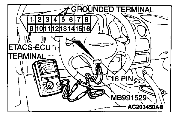 1. Use special tool MB991529 to connect a voltmeter between ground terminal 4 or 5 and ETACS-ECU terminal 9 of the data link connector.