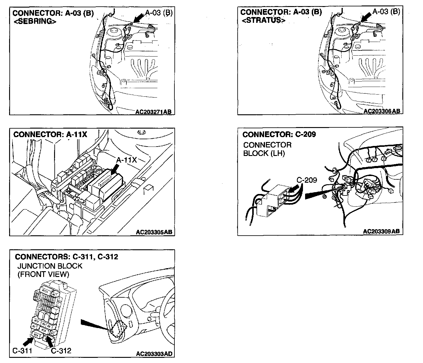 NOTE: Also check intermediate connector C-209, junction block connectors C-311 and C-312 for loose, corroded, or damaged terminals, or terminals pushed back in the connector. If intermediate connector C-209, junction block connector C-311 or C-312 is damaged, repair or replace the damaged components) as described in Harness Connector Inspection.