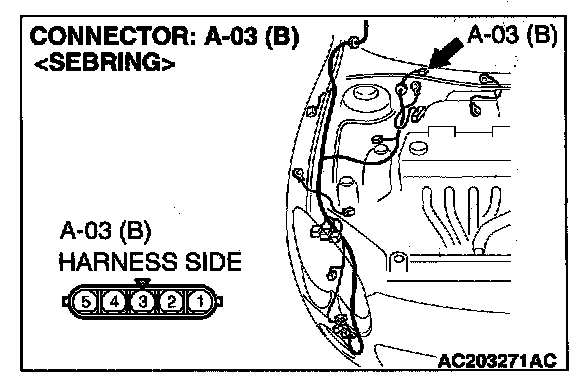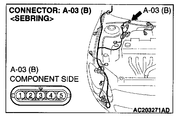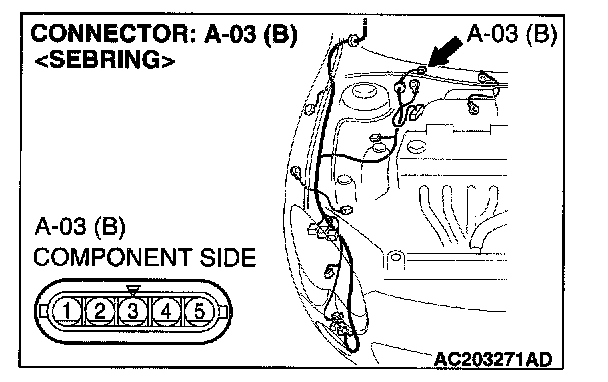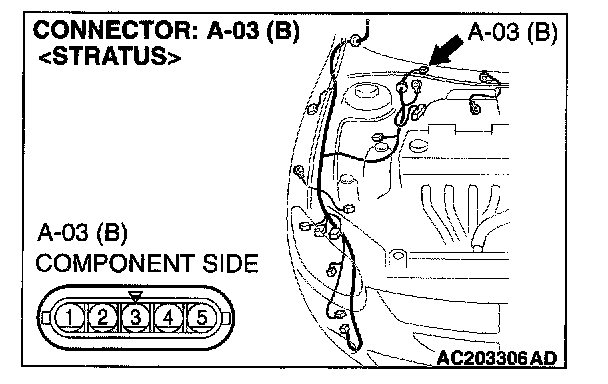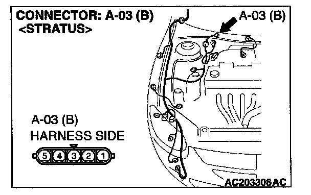 STEP 6. Check windshield wiper motor connector A-03 for loose, corroded or damaged terminals, or terminals pushed back in the connector.