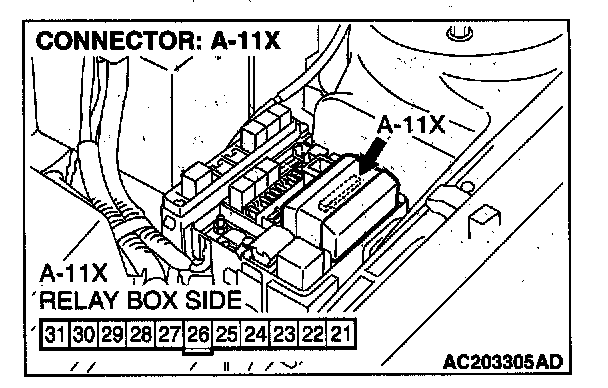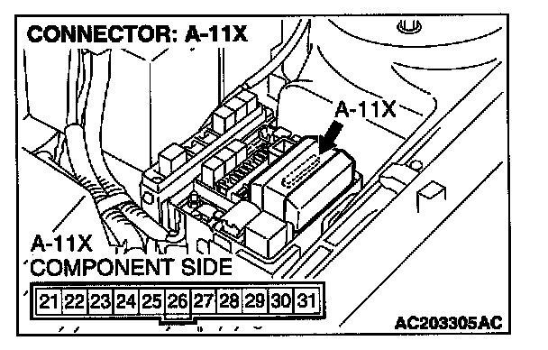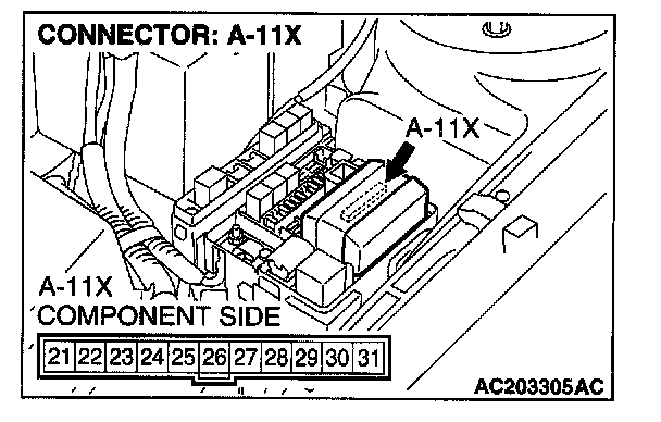 STEP 9. Check the front-ECU connector A-11X for loose, corroded or damaged terminals, or terminals pushed back in the connector.