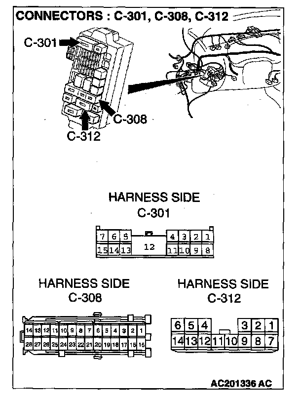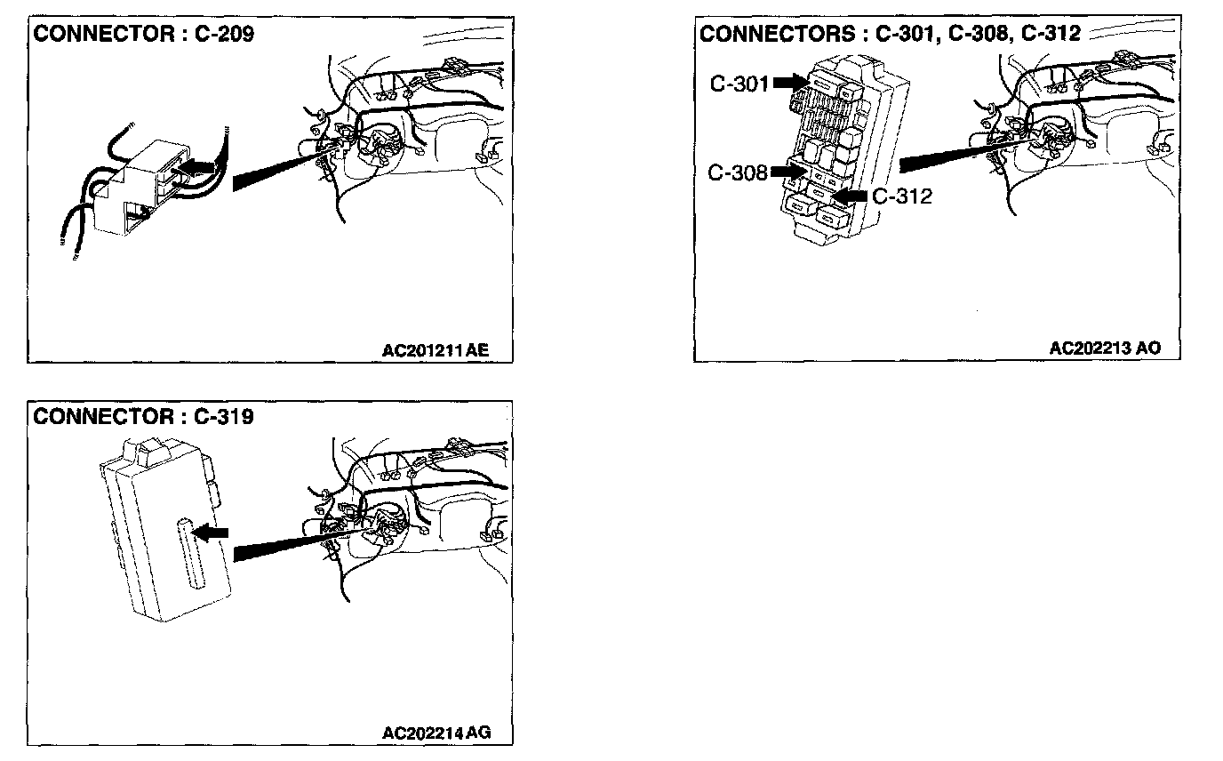 STEP 3. Check the ETACS-ECU connector C-319 and junction block connectors C-301, C-308 and C-312 for loose, corroded or damaged terminals, or terminals pushed back in the connector.