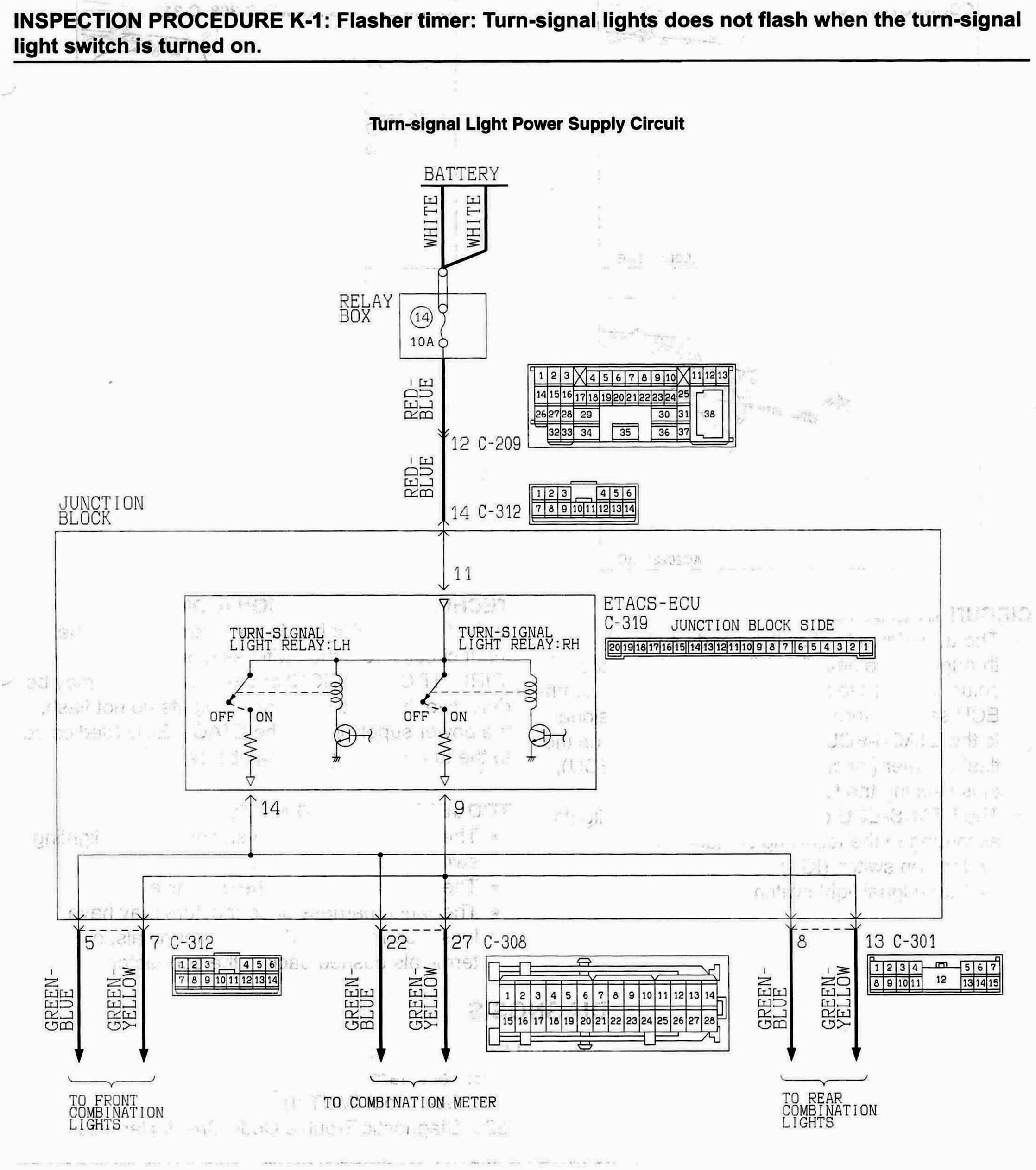 Is the turn-signal lights do not flash normally, the input circuits from the switches described in 'CIRCUIT OPERATION' or the ETACS-ECU may be defective. If the hazard warning lights do not flash, the power supply line to the ETACS-ECU (dedicated to the turn-signal lights) may be defective.
