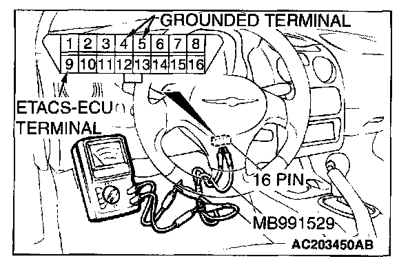 1. Use special tool MB991529 to connect a voltmeter between ground terminal 4 or 5 and ETACS-ECU terminal 9 of the data link connector.