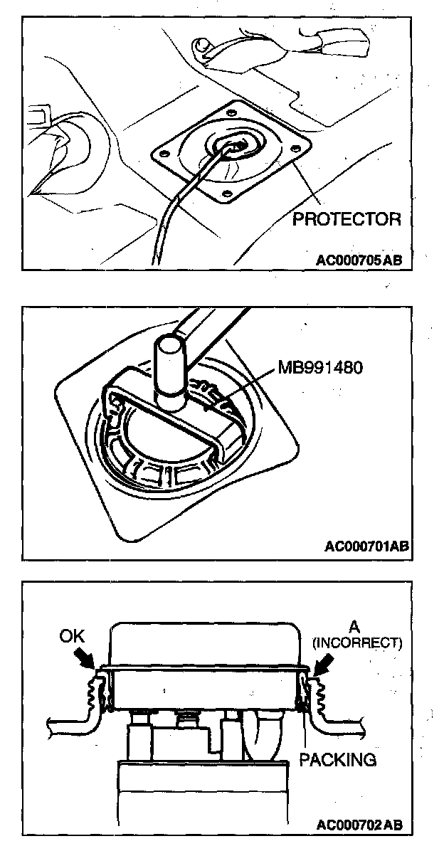 Install the packing to the fuel tank, and then install the fuel pump module to the fuel tank. Installing the packing to the fuel pump module will damage the packing lip when installing the fuel pump module to the fuel tank, and fuel leakage will occur.