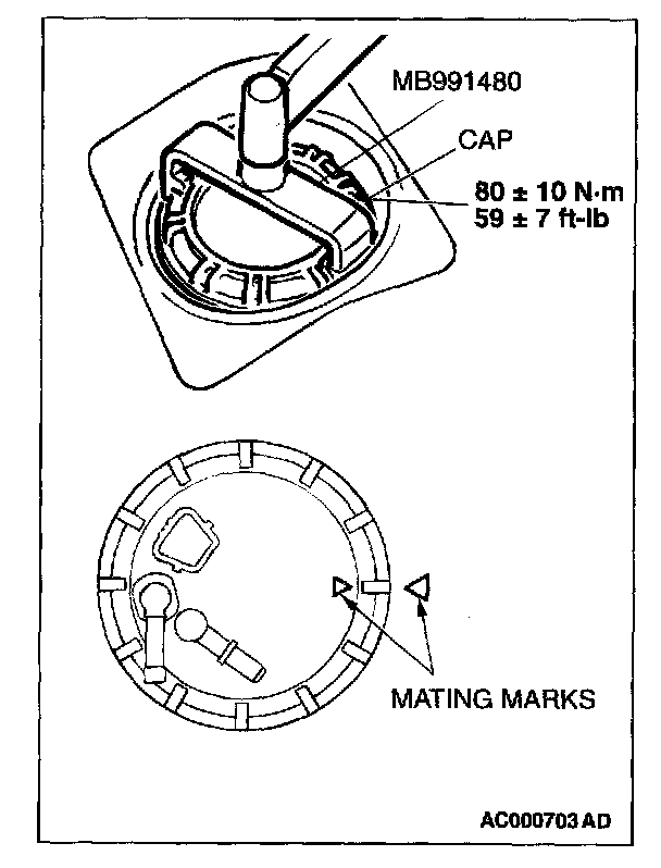 7. Use special tool MB991480 to align the mating marks on the fuel tank and fuel pump module, and tighten the cap to the specified torque.