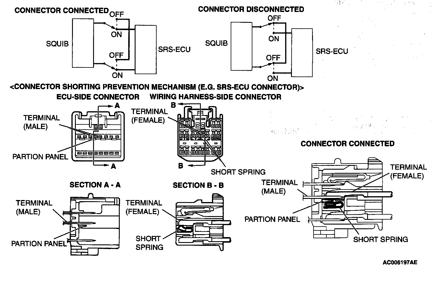 The switch is a mechanism that shorts the power supply terminal to the ground terminal automatically in the air bag squib circuit when the connector is disconnected. A "short" spring is integrated inside the connector. This spring prevents static electricity from flowing to the squib by shorting the power supply terminal to the ground terminal. (i:e. there is no potential difference between the two terminals.)