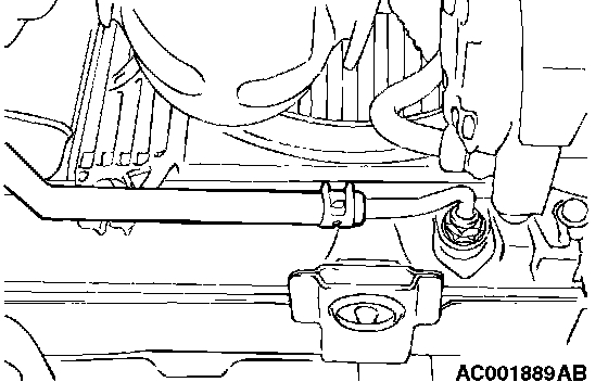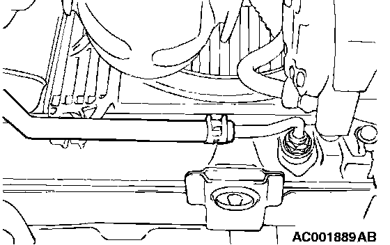 1. Disconnect the hose shown in the illustration which connects the transaxle and the oil cooler (inside the radiator). Place a container under the hose to collect the discharge.