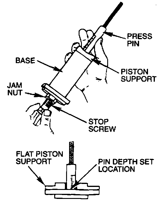 2. Thread the stop screw and jam nut assembly into the base. Fit the correct piston support on top of the base. Insert the press pin, threaded end up, into the hole in the piston support until the press pin touches the stop screw.