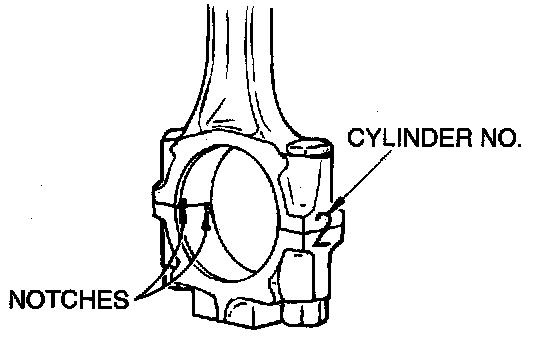 1. Mate the correct bearing cap with the correct connecting rod by checking with the alignment marks marked during disassembly. If a new connecting rod is used which has no alignment mark, position the notches for locking the bearing on the same side.